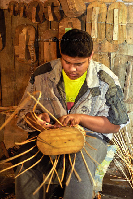 Trabalho de artesão. Rodrigo da Silva Antunes, 17 anos, confeccionando cesta de vime.