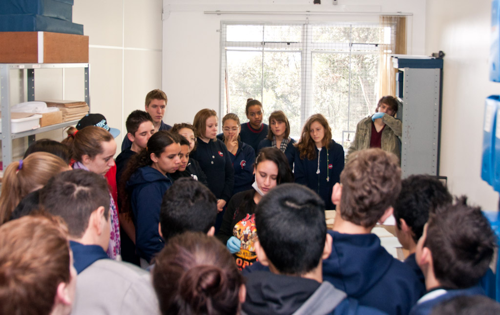 Visita dos alunos da EETCS (Escola Estadual Técnica de Caxias do Sul) ao IMHC. Na imagem, os acadêmicos do curso de História da UCS e estagiários do IMHC Francieli Formaio e Tianey Weiss explicam aos alunos como acontece o trabalho de higienização de documentos, bem como, a importância desse trabalho para a preservação de fontes históricas.