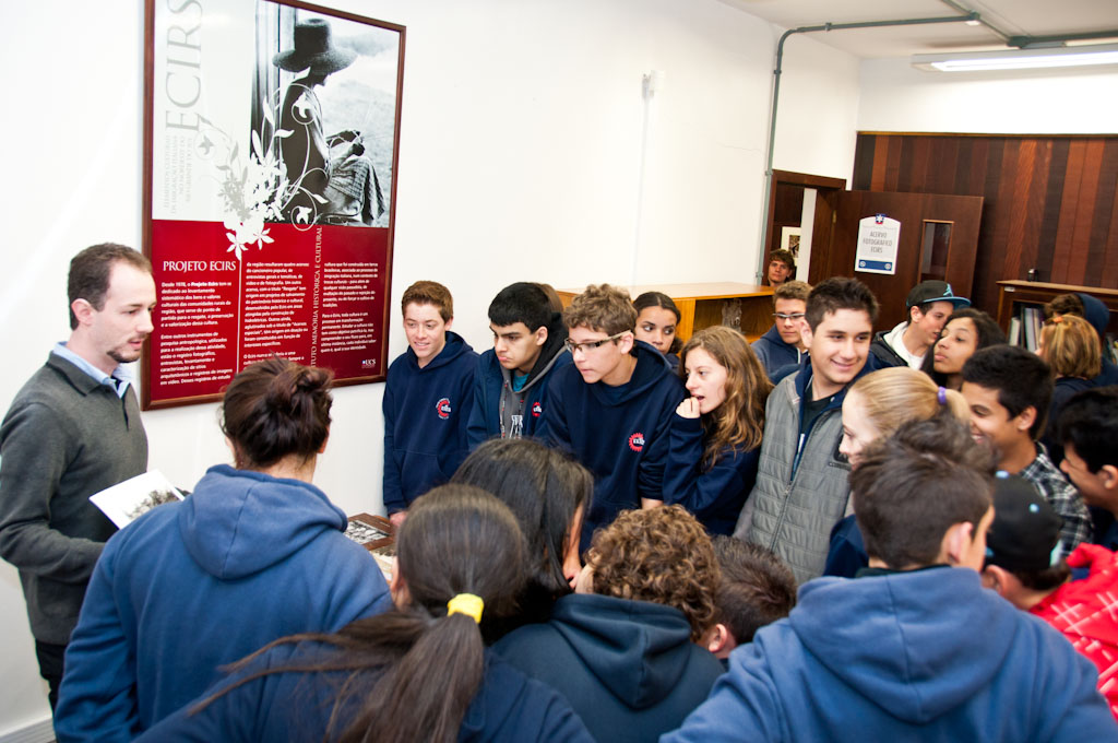 Visita dos alunos da EETCS (Escola Estadual Técnica de Caxias do Sul) ao IMHC. Na imagem, o funcionário Anthony Tessari apresenta fotografias que compõe o acervo fotográfico do Programa Ecirs/IMHC.