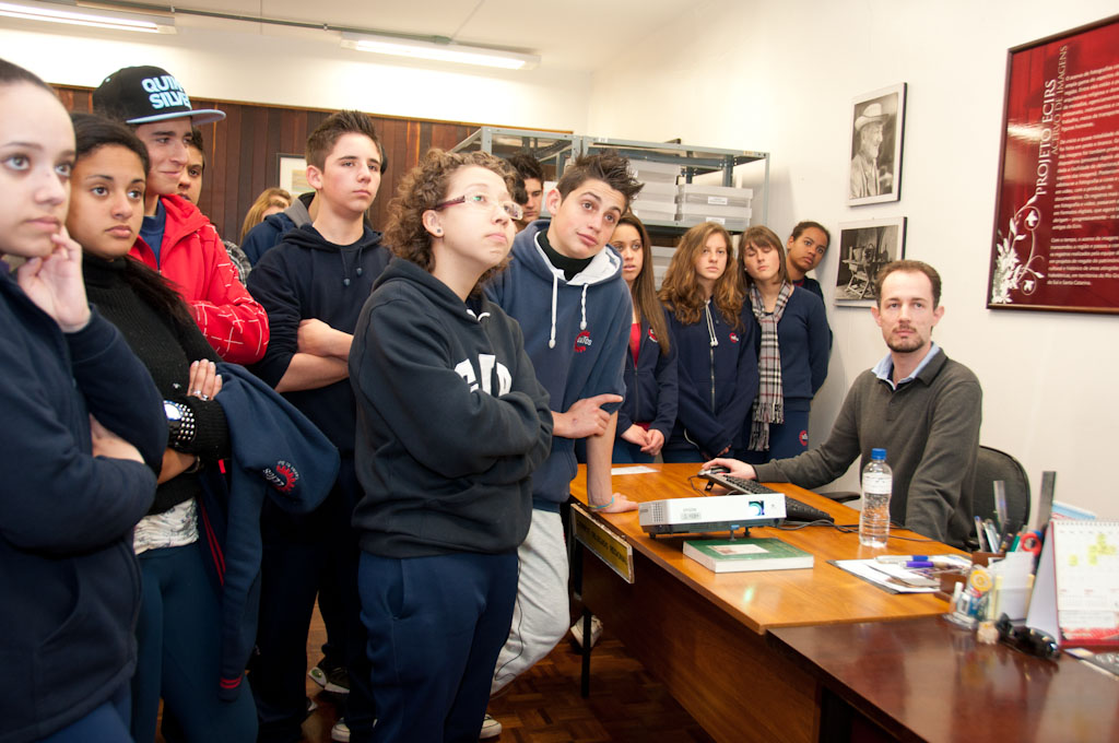 Visita dos alunos da EETCS (Escola Estadual Técnica de Caxias do Sul) ao IMHC. Na imagem, o funcionário Anthony Tessari apresenta aos alunos como ocorre o acesso ao banco de imagens do Programa Ecirs.