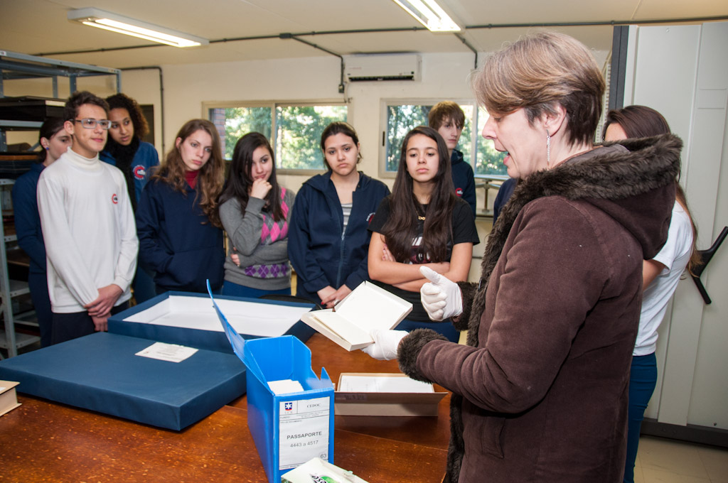 Visita dos alunos da EETCS (Escola Estadual Técnica de Caxias do Sul) ao IMHC. Momento em que os alunos acompanham apresentação da funcionária Angela Bertuol, a qual falou sobre o acervo custodiado pelo Centro de Documentação da UCS (CEDOC/IMHC). Angela mostrou aos alunos alguns passaportes doados pela RAI (Radio Audizioni Itália).