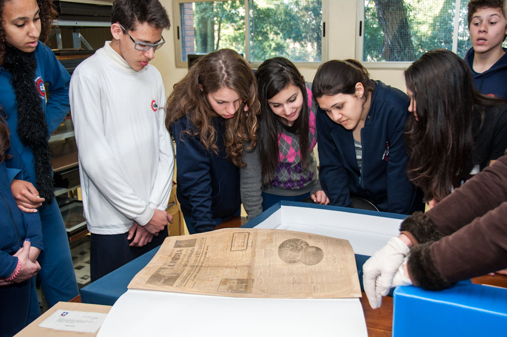 Visita dos alunos da EETCS (Escola Estadual Técnica de Caxias do Sul) ao IMHC. Momento em que os alunos observam um jornal que integra o acervo do Centro de Documentação da UCS (CEDOC/IMHC). Os alunos se impressionaram com as dimensões do jornal e com o período longínquo de produção, década de 1920.