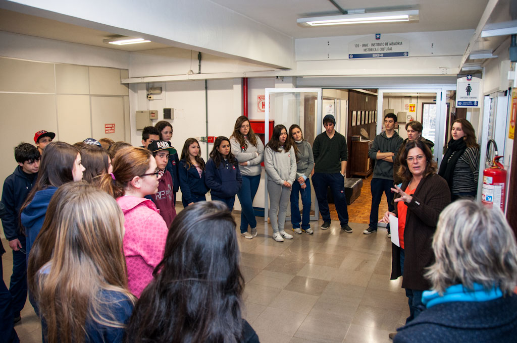 Visita dos alunos da EETCS (Escola Estadual Técnica de Caxias do Sul) ao IMHC. Momento em que os alunos acompanham apresentação da professora Katani Monteiro (coordenadora do CMRJU), a qual falou sobre a estrutura e os serviços prestados pelo IMHC à comunidade.