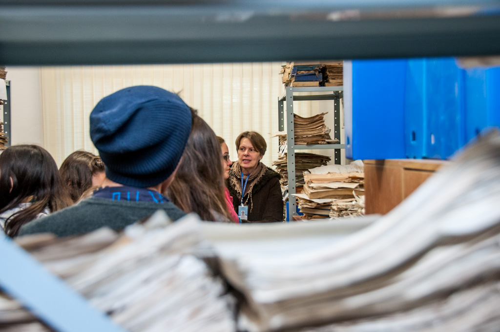 Visita dos alunos da EETCS (Escola Estadual Técnica de Caxias do Sul) ao IMHC. Momento em que os alunos acompanham apresentação da funcionária Angela Bertuol sobre o acervo histórico da Polícia Civil, recém recebido pelo IMHC, e que vem passando por procedimentos de conservação.