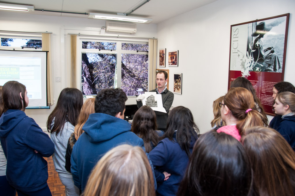 Visita dos alunos da EETCS (Escola Estadual Técnica de Caxias do Sul) ao IMHC. Momento em que os alunos acompanham apresentação do funcionário Anthony Tessari, o qual falou sobre as temáticas visuais mais recorrentes em todo o acervo fotográfico do Programa Ecirs.