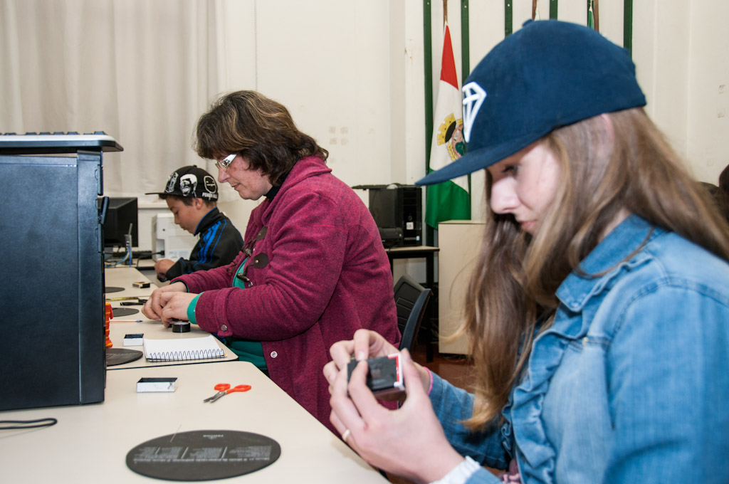 A cena mostra os participantes confeccionando a câmera pinlux, que é feita com materiais simples e reaproveitáveis, como caixinha de fósforo, fita isolante, pilhas/baterias usadas, latinha de refrigerante e filme fotográfico em película de 35mm.
