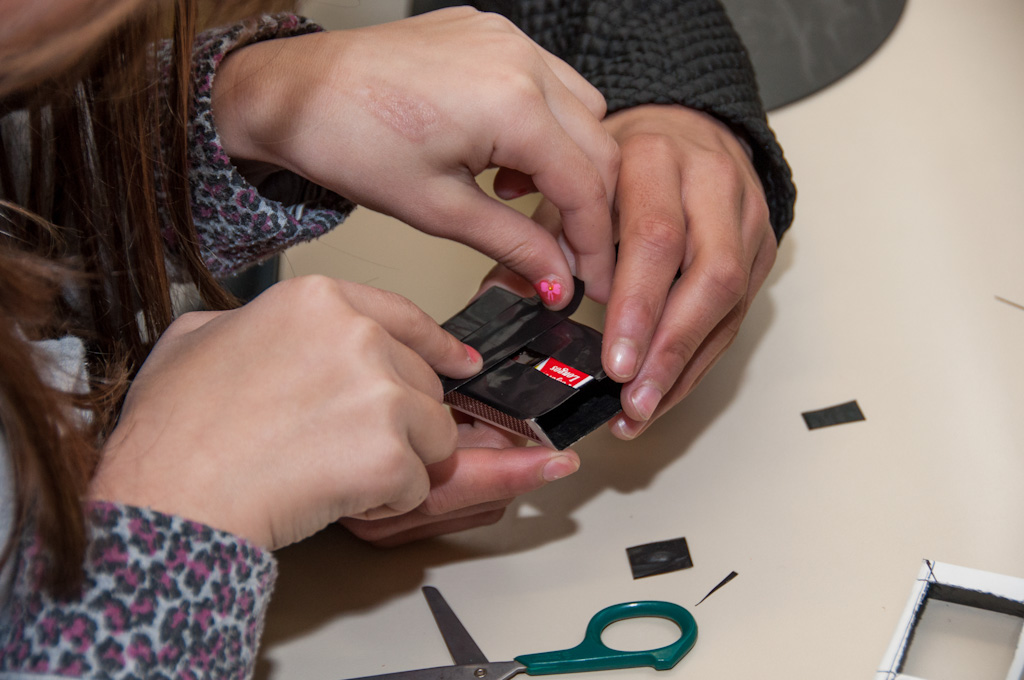 A cena mostra os participantes confeccionando a câmera pinlux, que é feita com materiais simples e reaproveitáveis, como caixinha de fósforo, fita isolante, pilhas/baterias usadas, latinha de refrigerante e filme fotográfico em película de 35mm.