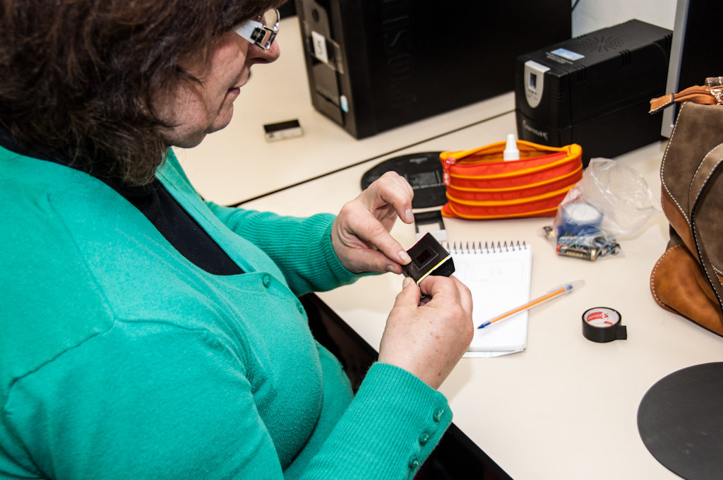 A cena mostra uma das participantes confeccionando a câmera pinlux, que é feita com materiais simples e reaproveitáveis, como caixinha de fósforo, fita isolante, pilhas/baterias usadas, latinha de refrigerante e filme fotográfico em película de 35mm.