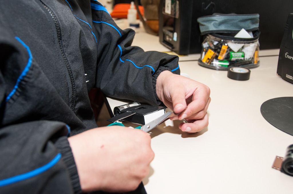 A cena mostra um dos participantes confeccionando a câmera pinlux, que é feita com materiais simples e reaproveitáveis, como caixinha de fósforo, fita isolante, pilhas/baterias usadas, latinha de refrigerante e filme fotográfico em película de 35mm.
