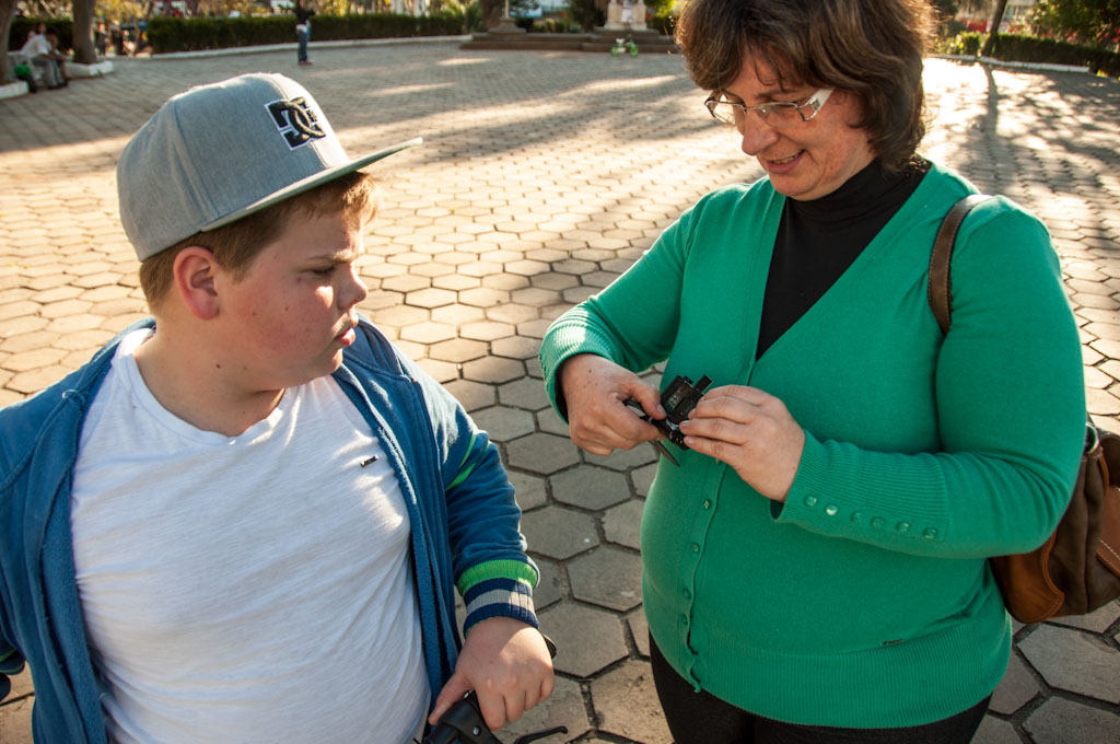 A cena mostra uma das participantes fotografando com a câmera pinlux, que é feita com materiais simples e reaproveitáveis, como caixinha de fósforo, fita isolante, pilhas/baterias usadas, latinha de refrigerante e filme fotográfico em película de 35mm.