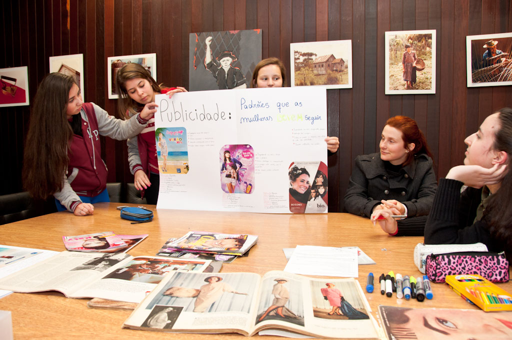Oficina realizada com alunos dos 1º, 2º e 3º anos da Escola Estadual Professor Apolinário Alves dos Santos, de Caxias do Sul. A oficina consistia em analisar fotografias publicitárias constantes em anúncios de revistas como 'Capricho', 'Atrevida', 'Boa Forma', 'Corpo a Corpo', 'Veja', 'Lola' e 'Cláudia', buscando interpretar representações da mulher (ou do gênero feminino) nessas publicações. Os alunos deviam confeccionar cartazes para sintetizar e apresentar ao grupo suas análises. A oficina foi ministrada pelo funcionário do IMHC Anthony Beux Tessari.