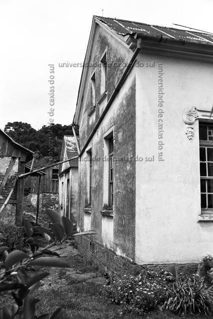 Descrição: Casa de dormir em tijolos industrializados rebocados com portas e janelas com frontispício decorado com peças de cimento. Propriedade da família Barbieri.