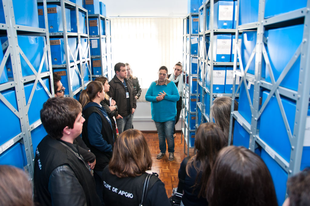 Visita da equipe de professores, funcionários e bolsistas da Universidade de Passo Fundo (UPF) ao Instituto Memória Histórica e Cultural (IMHC) da UCS. Momento em que a professora Katani Monteiro (coordenadora do Centro de Memória Regional do Judiciário - CMRJU) explica aos visitantes o funcionamento do centro de memória, as tipologias dos processos encontradas no acervo e como vem ocorrendo o tratamento técnico da documentação custodiada