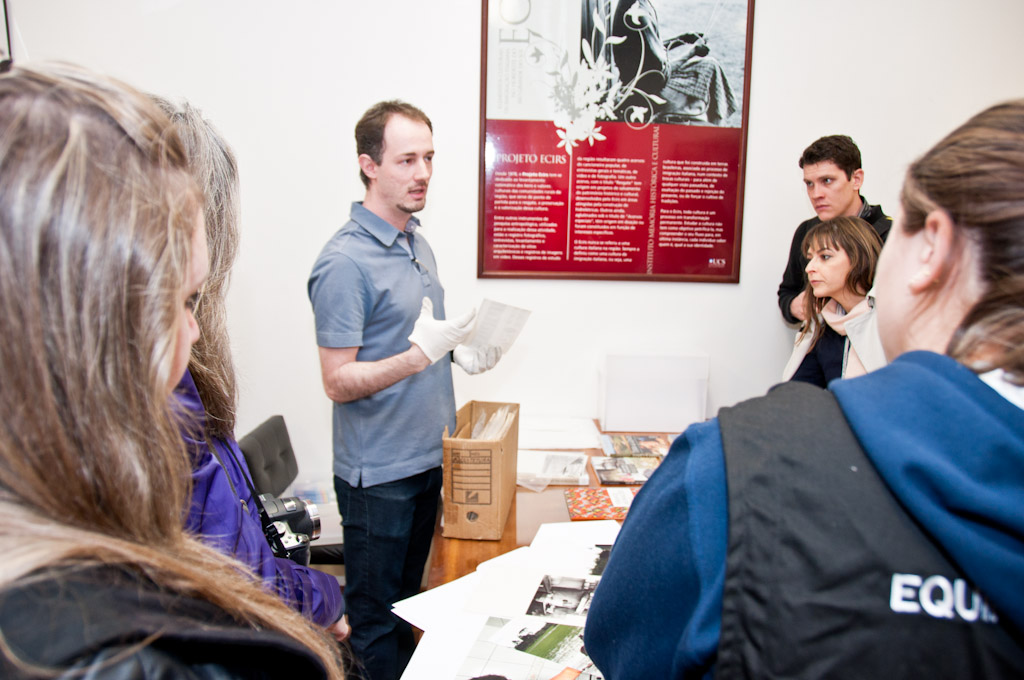 Visita da equipe de professores, funcionários e bolsistas da Universidade de Passo Fundo (UPF) ao Instituto Memória Histórica e Cultural (IMHC) da UCS. Momento em que o funcionário Anthony Tessari explica aos visitantes como vem ocorrendo o tratamento técnico do acervo fotográfico do Programa ECIRS.